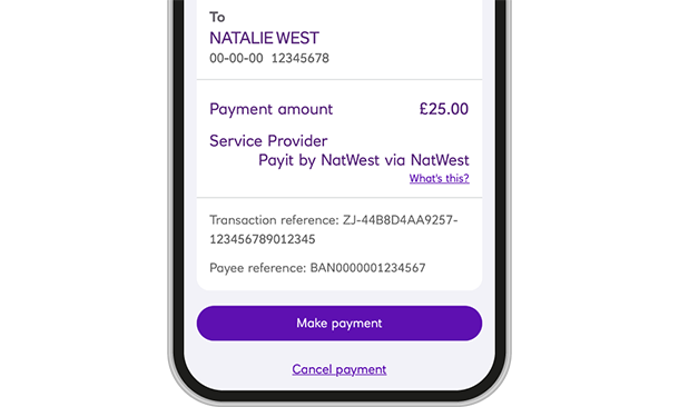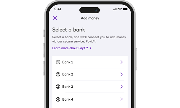 Add money uses NatWest Payit™ to make payments between your accounts, without the need for bank details. It uses Open Banking to connect you to the mobile or online banking of your other bank, allowing you to securely log in with your banking credentials and approve your Add money payment.